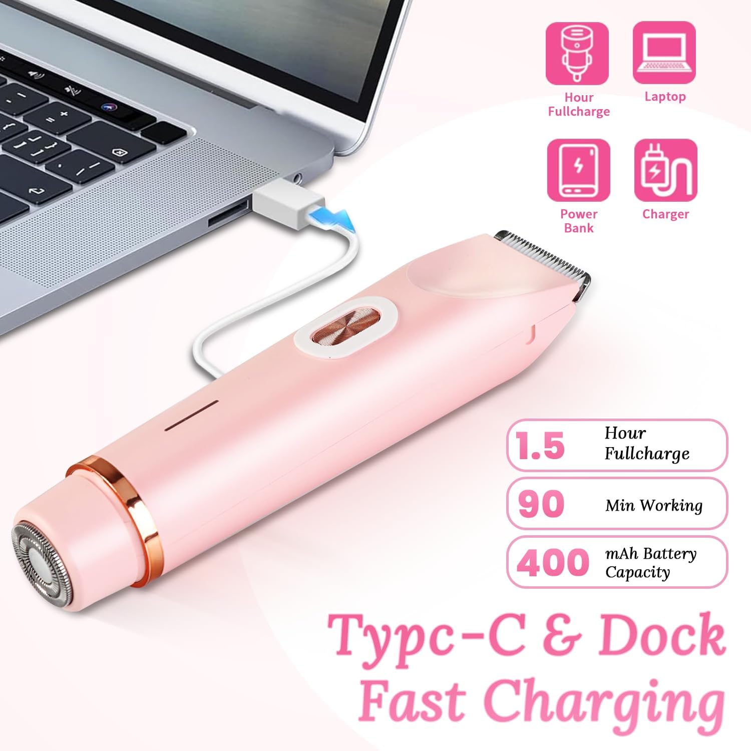 Typical runtime is 60–90 minutes per full charge and recharges via USB in about 1.5–2 hours. Actual runtime varies by hair type and usage.